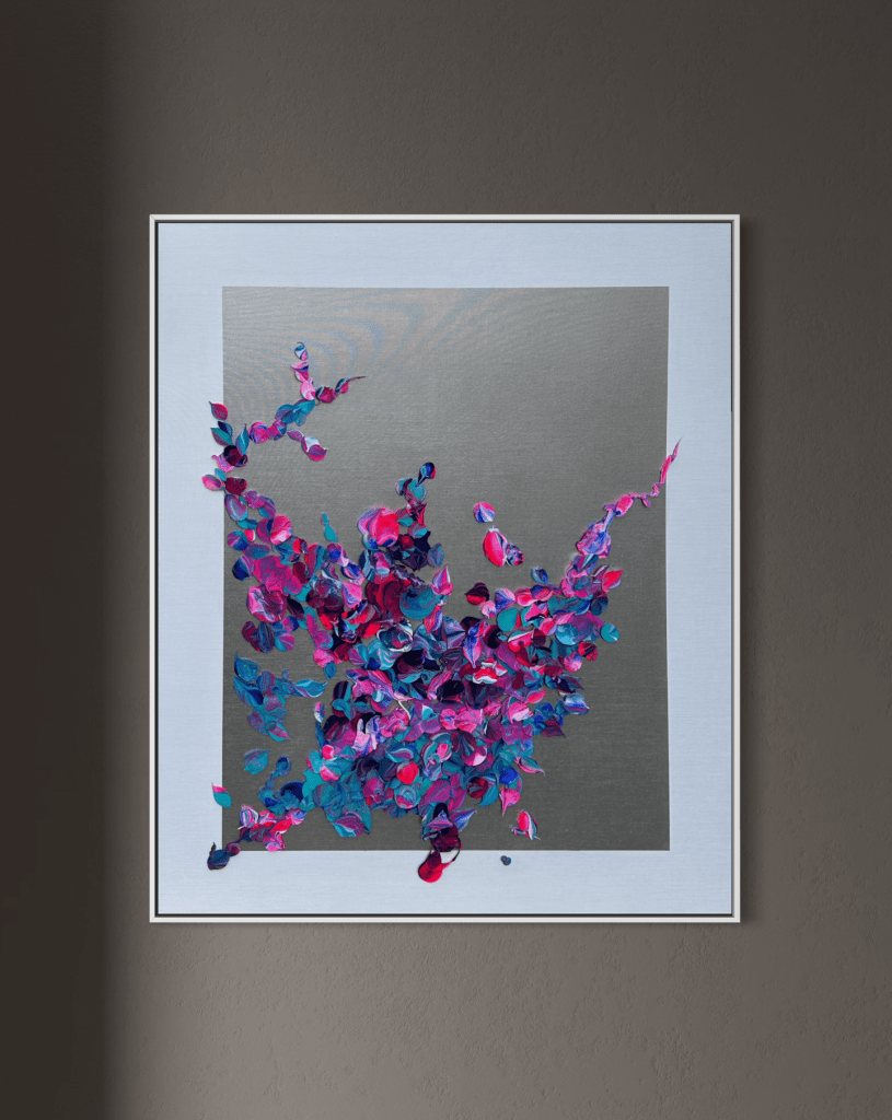 2026 | collage of dried acrylic on metallic sprayed canvas | 100 x 120 cm | white wood frame